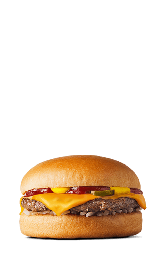 Beef pattie, onions, pickle, ketchup, mustard, and cheese on a soft burger bun.