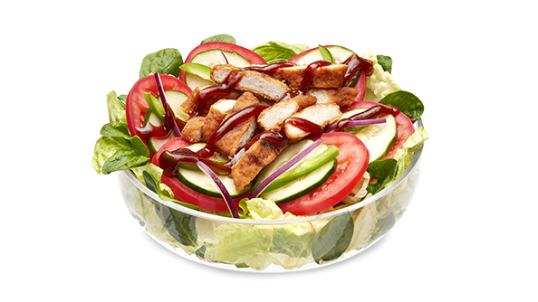 Nutritional information based on a salad (regular or large) that includes chicken patty, lettuce, spinach, tomato, cucumbers, onions, capsicum, olives, and carrots.